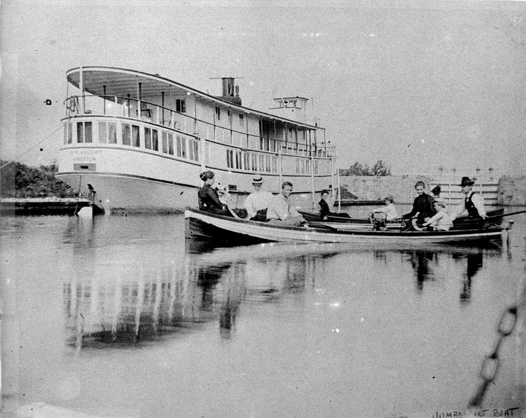 Row-boat Jumbo with the Hicks family near steamer John Haggart, Beveridges Lockstation, c. 1900.
