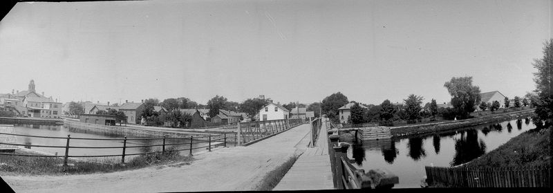 View north down Drummond Street to Tay Canal and Cockburn Island; Town Hall far left; 'forwarding sheds' at left across canal (presumed)