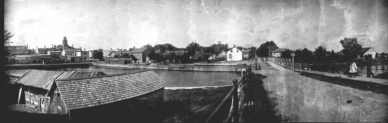 | View north down Drummond Street across Tay Canal, slightly to the west of previous photo; Cockburn Island ahead; Town Hall far left; presumed 'forwarding shed' across canal at left; sheds close left are now gone. |