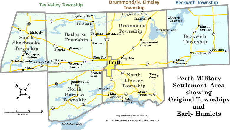 This map shows the Town of Perth and the original six townships of the Perth Military Settlement Area. The early hamlets and sites around which the settlement gradually took place are also shown.